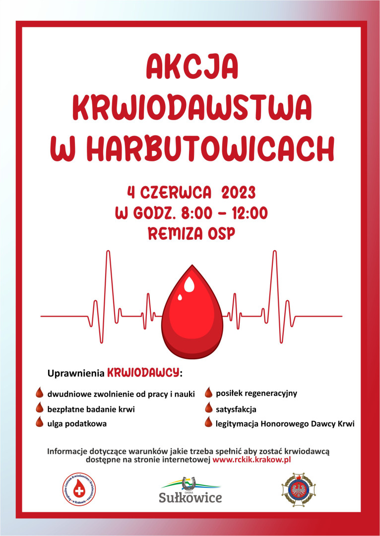 Urząd Miejski wraz z Ochotniczą Strażą Pożarną w Harbutowicach zapraszają Mieszkańców Gminy Sułkowice do udziału w „Akcji Krwiodawstwa”, która odbędzie się 4 czerwca br. (niedziela) w Remizie OSP w Harbutowicach, w godzinach od 8:00 do 12:00.
