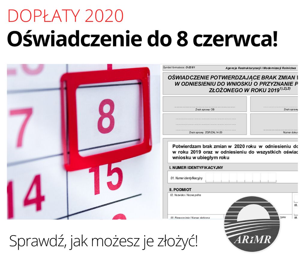 W tym roku po raz kolejny rolnicy starający się o dopłaty bezpośrednie lub obszarowe mogą skorzystać z ułatwienia jakim jest możliwość złożenia oświadczenia potwierdzającego brak zmian w odniesieniu do wniosku o przyznanie płatności złożonego w 2019 r. Złożenie oświadczenia jest równoznaczne ze złożeniem wniosku o przyznanie płatności na rok 2020. Tegoroczna kampania rozpoczęła się 1 marca, jednak w związku z wprowadzeniem w Polsce stanu epidemii, od 31 marca zawieszony został bieg terminów.