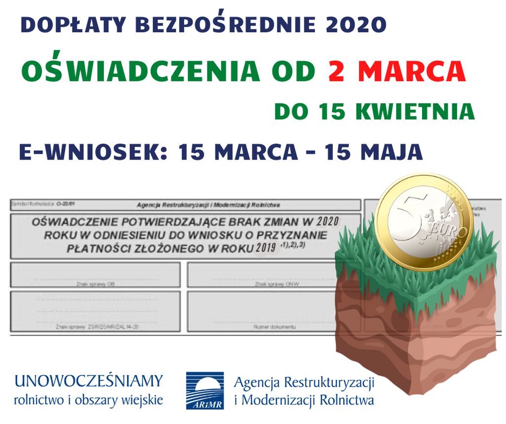 Dotychczas Agencja Restrukturyzacji i Modernizacji Rolnictwa przyjmowała oświadczenia od 15 lutego do 14 marca. W tym roku termin ten uległ zmianie. Oświadczenie będzie można dostarczyć do placówek ARiMR od 2 marca do 15 kwietnia.