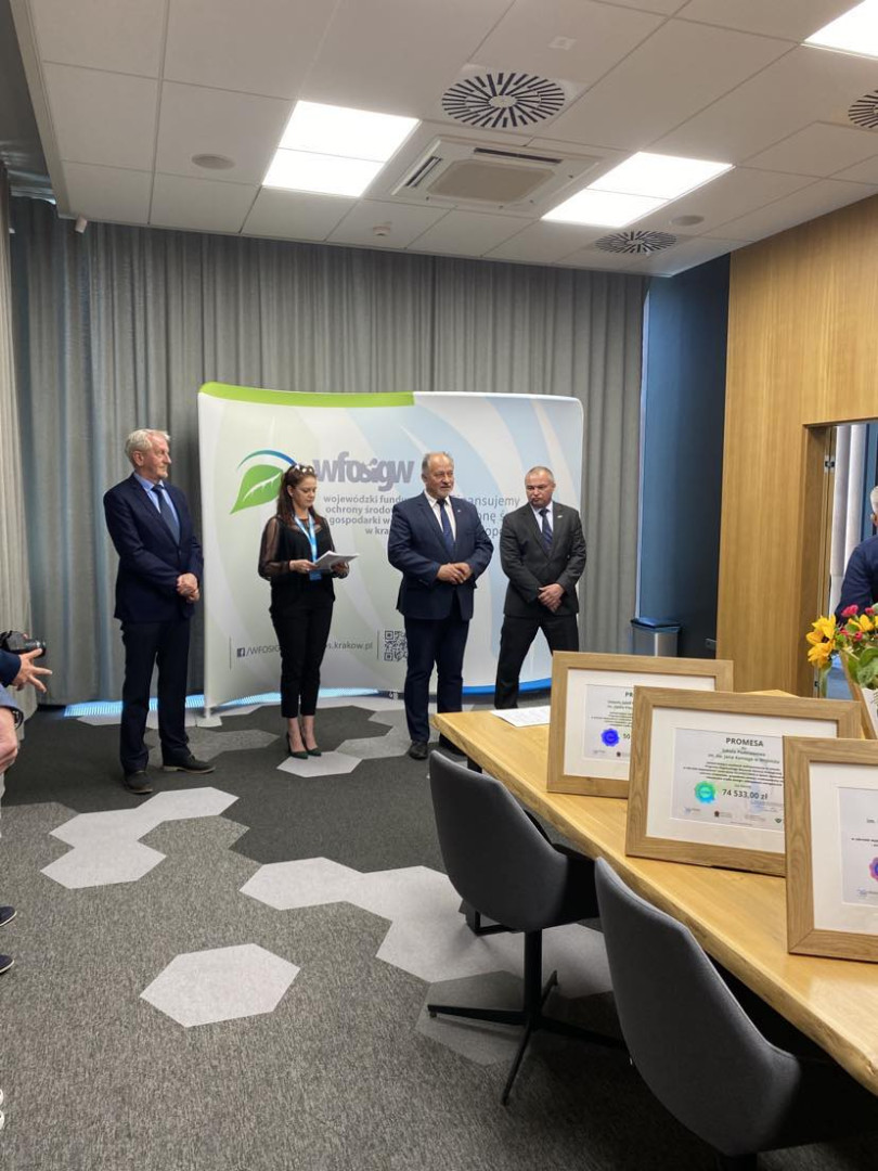 W dniu 5 czerwca 2023 roku delegacja ze Szkoły Podstawowej nr 2 w Sułkowicach w osobie Pana Dyrektora Marcelego Pacuta oraz przewodniczącej Szkoły Anny Lipińskiej wraz z p. Burmistrzem Arturem Grabczykiem oraz pracownikami Urzędu Miejskiego w Sułkowicach: Kierownik Referatu Ochrony Środowiska Panią Barbarą Sroką oraz Ekodoradcą Panią Patrycją Bujas, odebrali z rąk Prezesa Wojewódzkiego Funduszu Ochrony Środowiska i Gospodarki Wodnej w Krakowie pana Kazimierza Koprowskiego, promesę w wysokości 49.500,00zł na stworzenie Ekopracowni.