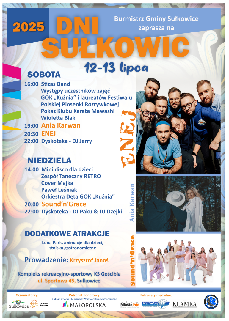 Już w weekend 12-13 lipca br. na sułkowickiej scenie wystąpią gwiazdy krajowego formatu: zespół Enej, Ania Karwan oraz Sound’n’Grace, a w późnych godzinach wieczornych DJ-e: Jerry, Paku i Dzejki porwą do wspólnej zabawy tanecznymi hitami. To będzie niezapomniana muzyczna uczta dla miłośników dobrej zabawy i świetnej muzyki!