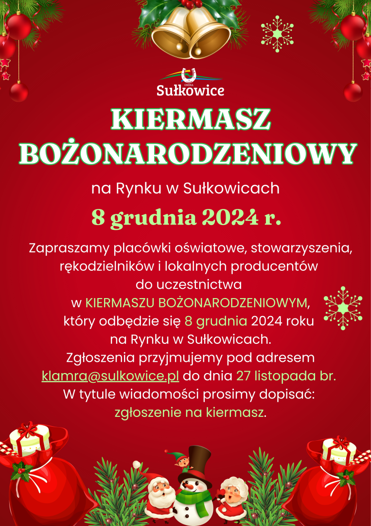 który odbędzie się 8 grudnia 2024 roku na Rynku w Sułkowicach. Zgłoszenia przyjmujemy pod adresem klamra@sulkowice.pl do dnia 27 listopada br.