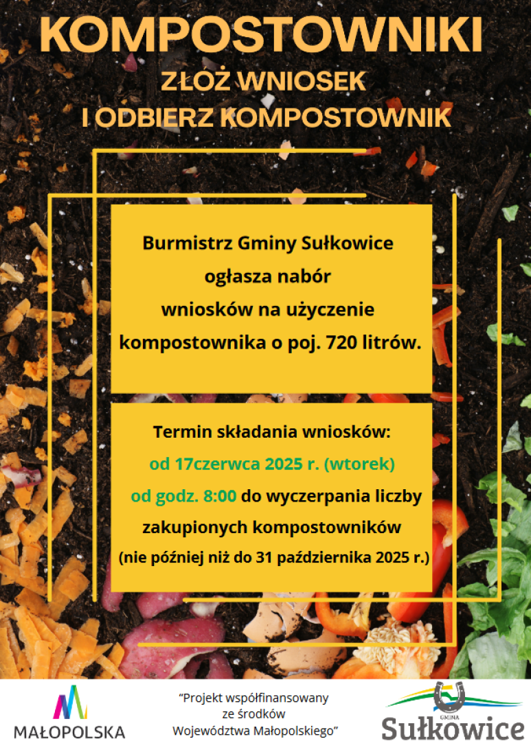 Burmistrz Gminy Sułkowice ogłasza nabór wniosków na użyczenie kompostownika o poj. 720 litrów, w ramach „Programu wsparcia finansowego dla gmin z terenu województwa małopolskiego w zakresie zaopatrzenia w kompostowniki.”