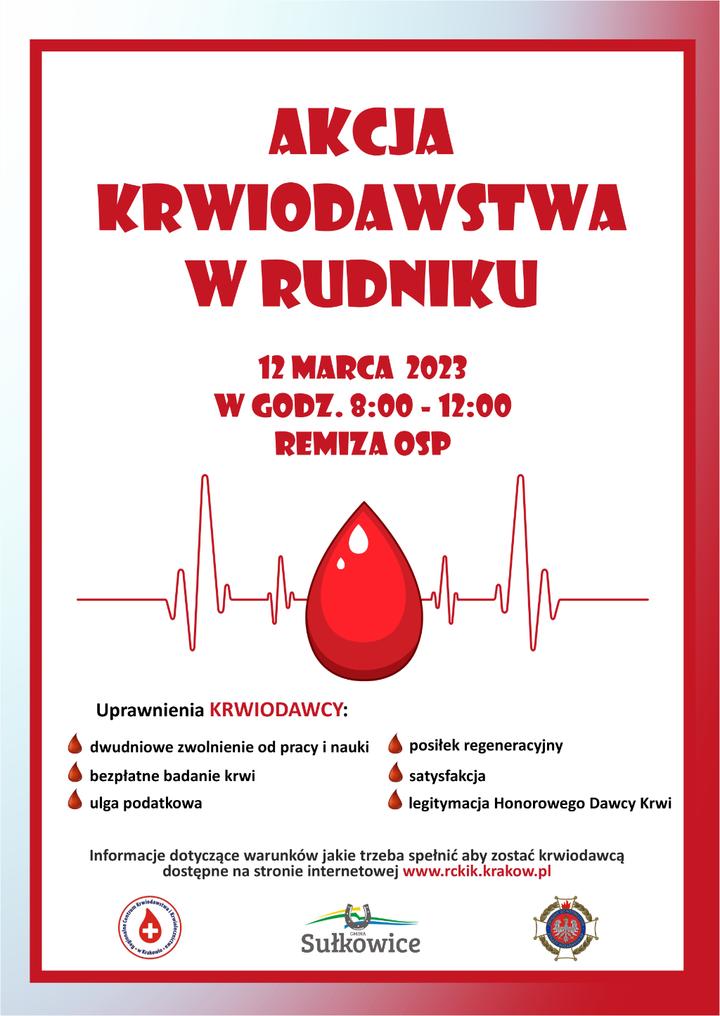 Urząd Miejski w Sułkowicach wraz z jednostką OSP Rudnik zapraszają do udziału w "Akcji Krwiodawstwa", która odbędzie się w dniu 12 marca br. w godz. 8:00 - 12:00 w Remizie OSP Rudnik.