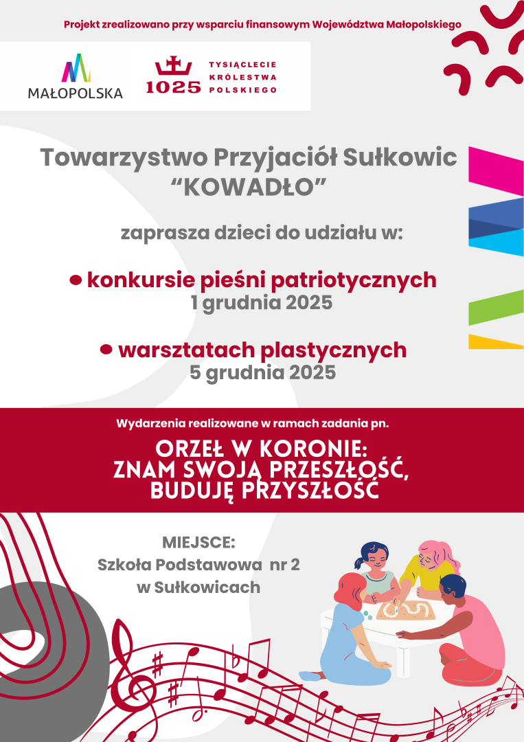 Towarzystwo Przyjaciół Sułkowic „Kowadło” zaprasza dzieci do udziału w przedsięwzięciach realizowanych w ramach zadania pn. „Orzeł w koronie: znam swoją przeszłość, buduję przyszłość”, które odbędą się w Szkole Podstawowej nr 2 w Sułkowicach.