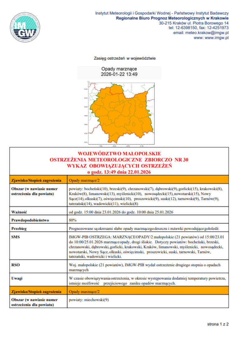 Ostrzeżenie meteorologiczne na dzień 23.01.2026 r. do 25.01.2026 r. – marznące opady.
