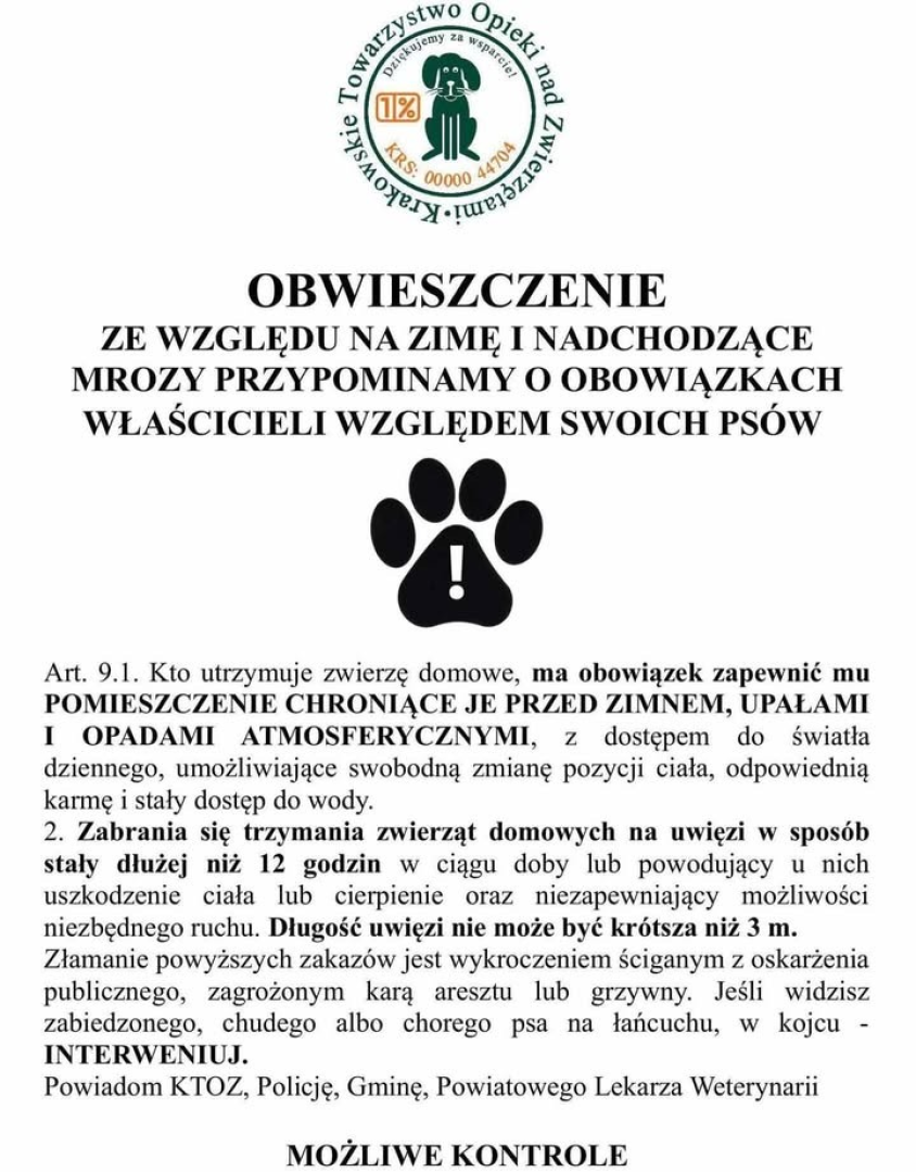 GOSPODARZU, JEŚLI TWÓJ PIES MIESZKA NA ZEWNĄTRZ, PAMIĘTAJ O SWOICH USTAWOWYCH OBOWIĄZKACH!