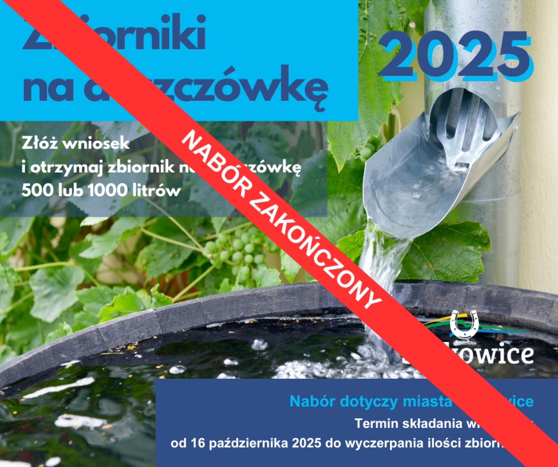 W związku z powyższym nabór do Programu zaopatrzenia mieszkańców w zbiorniki na deszczówkę – obszar miejski zostaje zakończony.