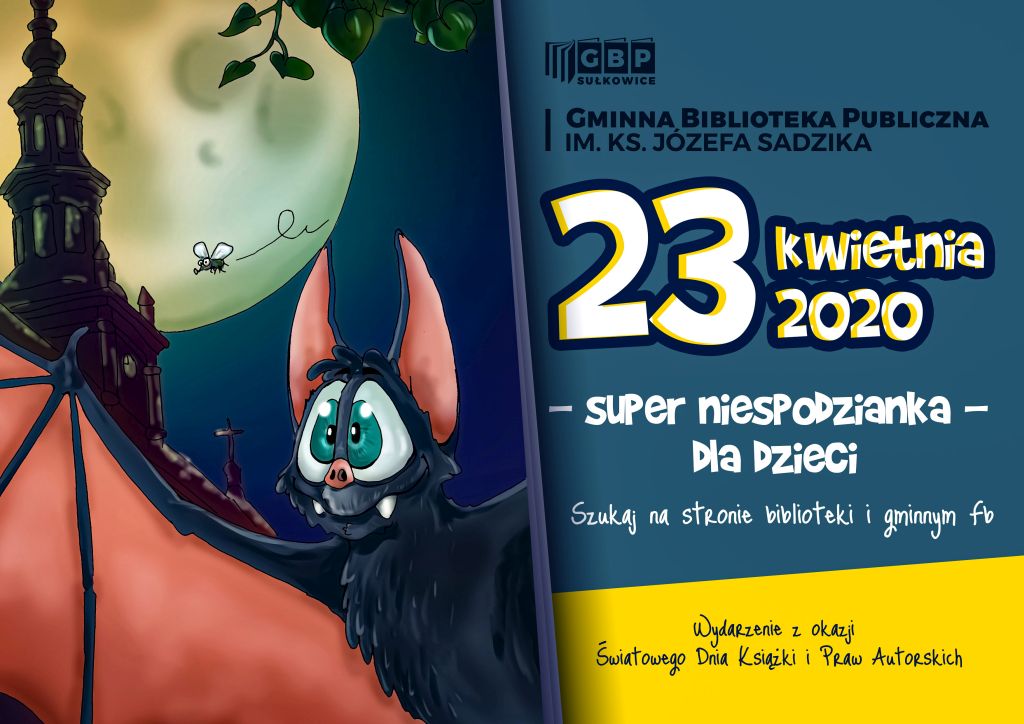 Już 23 kwietnia br. pojawi się super niespodzianka dla dzieci, którą przygotowują pracownicy Gminnej Biblioteki Publicznej w Sułkowicach. Zachęcamy do śledzenia wydarzeń na stronie biblioteki oraz gminnym profilu na Facebooku. Nowi, nocni bohaterowie porwą Was w wir przygód, który rozegra się w całej Gminie Sułkowice! Nie przegapcie wydarzenia!