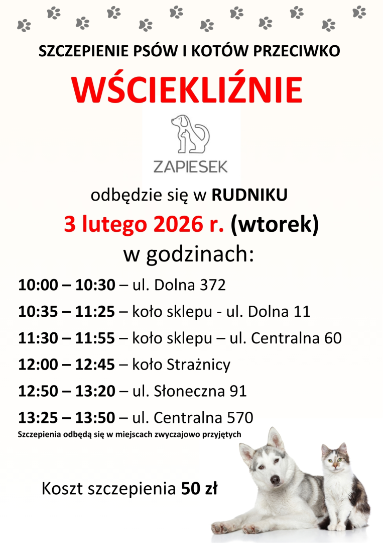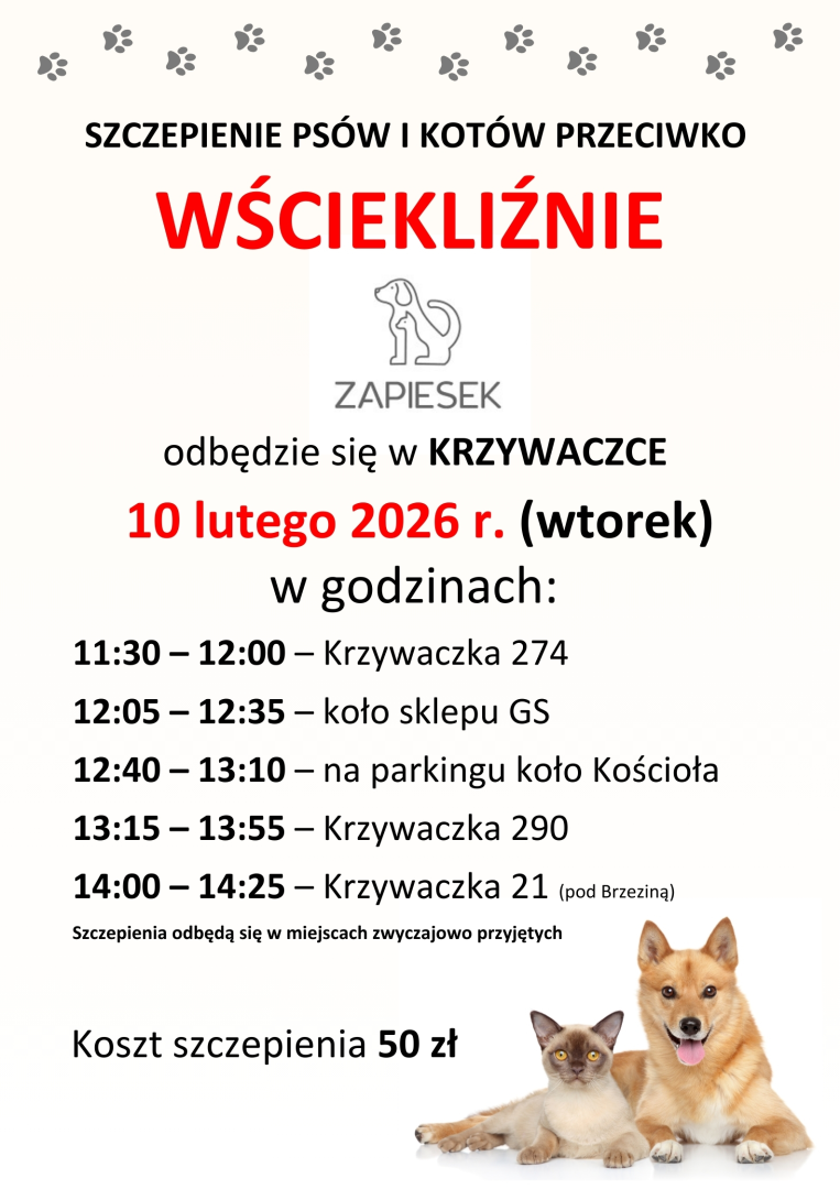 W zależności od ilości szczepionych zwierząt, poszczególne godziny mogą ulec przesunięciu.