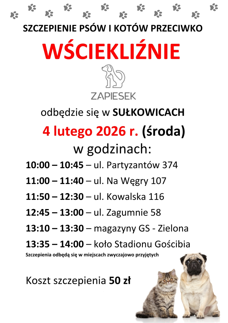 Terminy szczepień psów i kotów na terenie Gminy Sułkowice