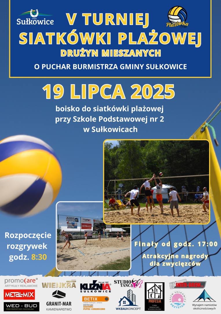 Zapraszamy wszystkich mieszkańców Gminy Sułkowice na V Turniej Siatkówki Plażowej Drużyn Mieszanych o puchar Burmistrza Gminy Sułkowice - 19 lipca 2025 r. - boisko boczne do siatkówki plażowej przy Szkole Podstawowej nr 2 w Sułkowicach.
