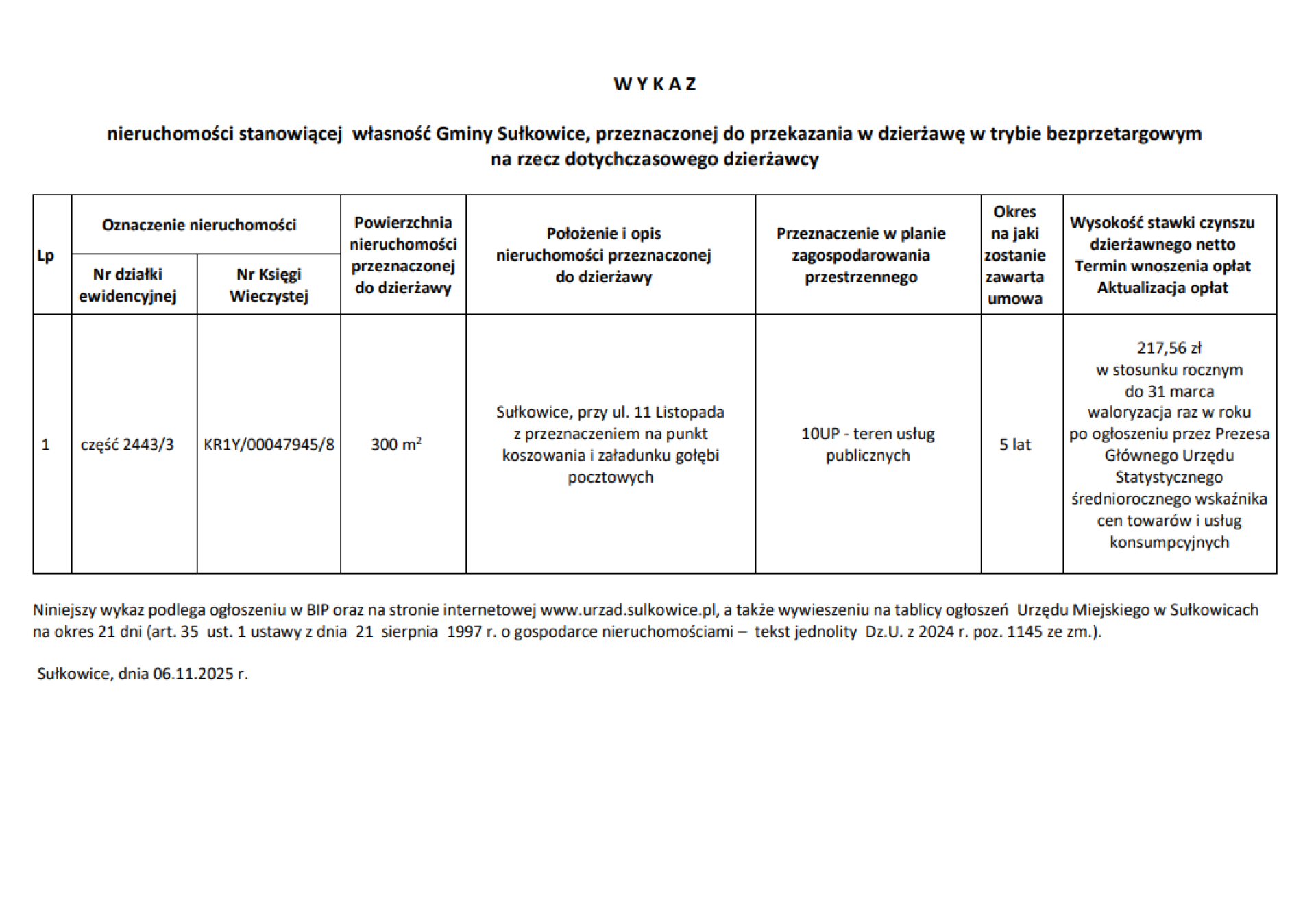 W Y K A Z nieruchomości stanowiącej własność Gminy Sułkowice, przeznaczonej do przekazania w dzierżawę w trybie bezprzetargowym na rzecz dotychczasowego dzierżawcy - przy ul. 11 Listopada