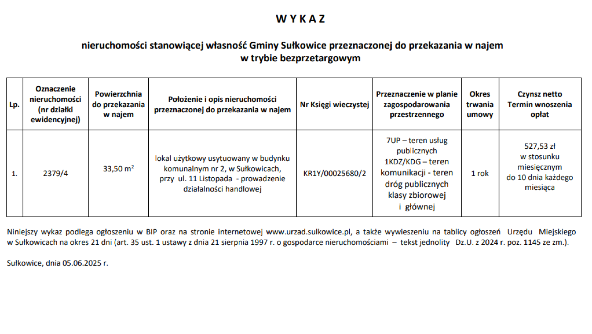 Wykaz nieruchomości stanowiącej własność Gminy Sułkowice przeznaczonej do przekazania w najem w trybie bezprzetargowym: kliknij tutaj