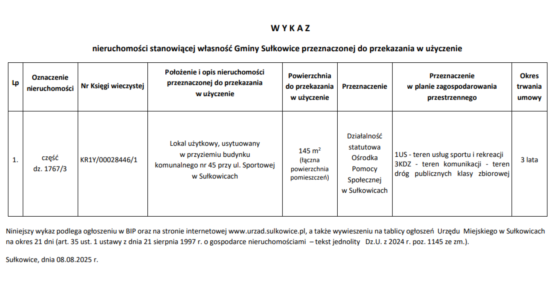 W Y K A Z nieruchomości stanowiącej własność Gminy Sułkowice przeznaczonej do przekazania w użyczenie - budynek komunalny przy ul. Sportowej 45 w Sułkowicach