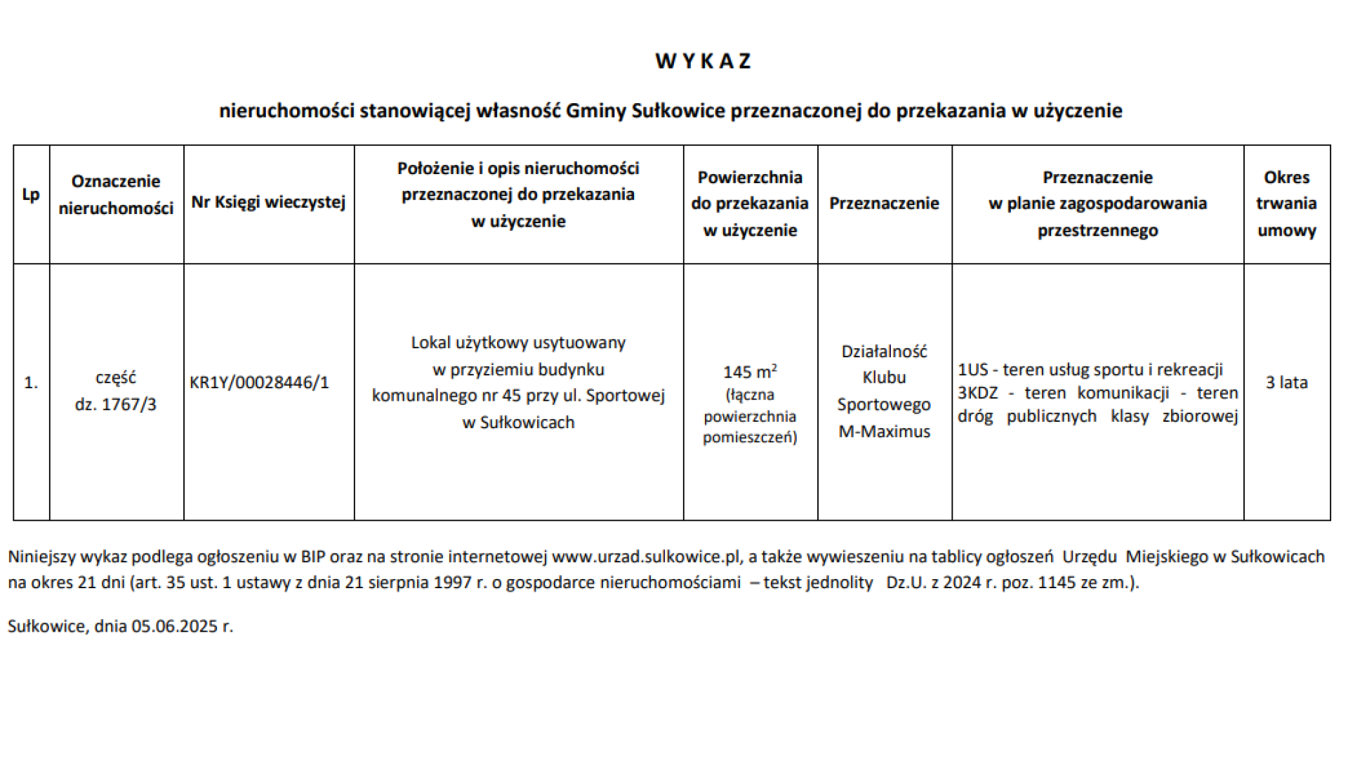 W Y K A Z nieruchomości stanowiącej własność Gminy Sułkowice przeznaczonej do przekazania w użyczenie - lokal usytuowany w przyziemiu budynku o nr 45 przy ul. Sportowej