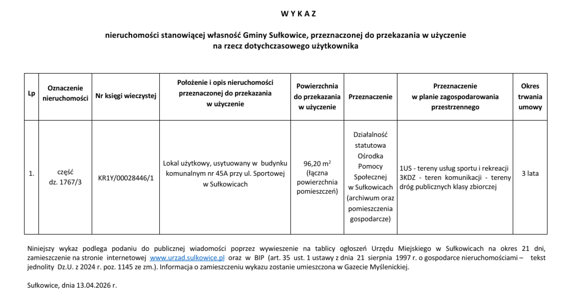 W Y K A Z nieruchomości stanowiącej własność Gminy Sułkowice, przeznaczonej do przekazania w użyczenie na rzecz dotychczasowego użytkownika - ul. Sportowa