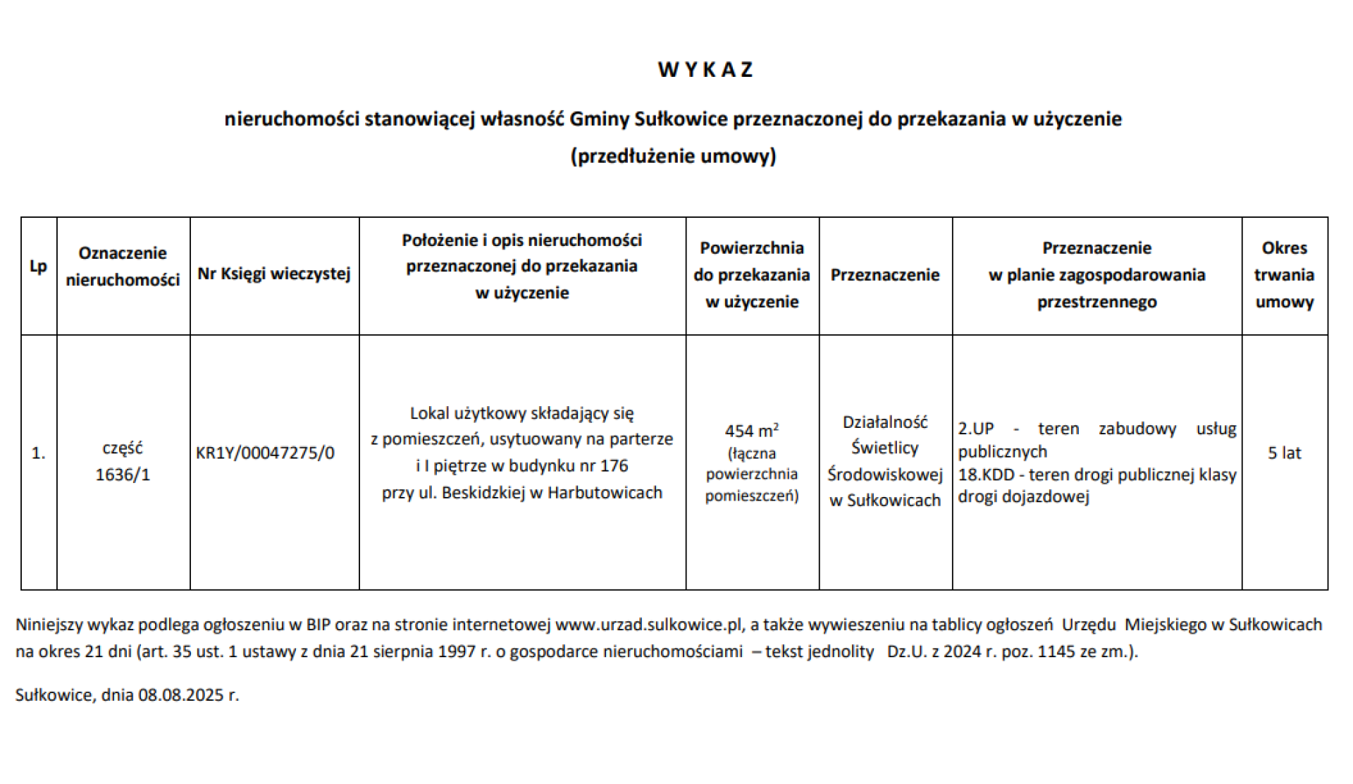 W Y K A Z nieruchomości stanowiącej własność Gminy Sułkowice przeznaczonej do przekazania w użyczenie (przedłużenie umowy) - ul. Beskidzkiej w Harbutowicach