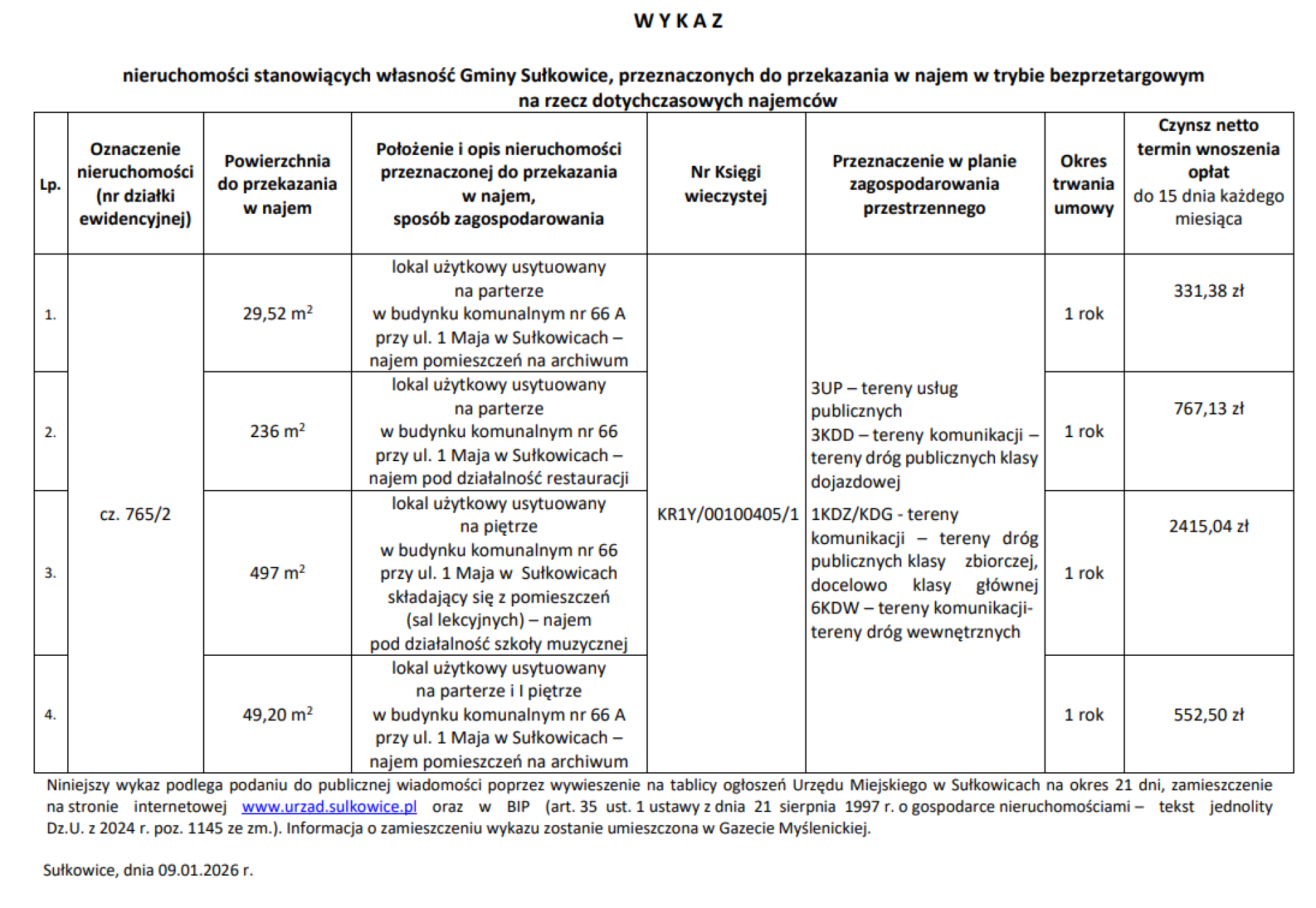 W Y K A Z - nieruchomości stanowiących własność Gminy Sułkowice, przeznaczonych do przekazania w najem w trybie bezprzetargowym na rzecz dotychczasowych najemców - ul. 1 Maja