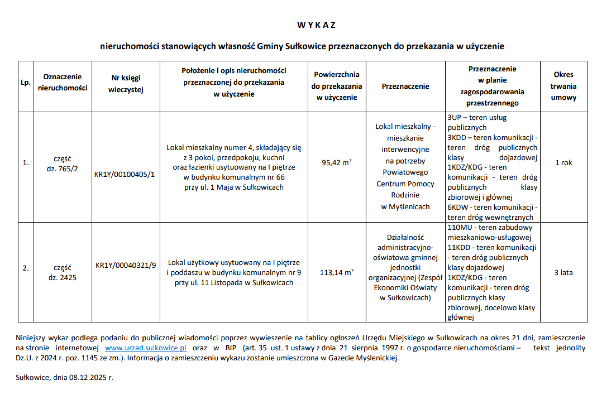W Y K A Z nieruchomości stanowiących własność Gminy Sułkowice przeznaczonych do przekazania w użyczenie - lokal mieszkalny przy ul. 1 Maja, lokal użytkowy przy ul. 11 Listopada