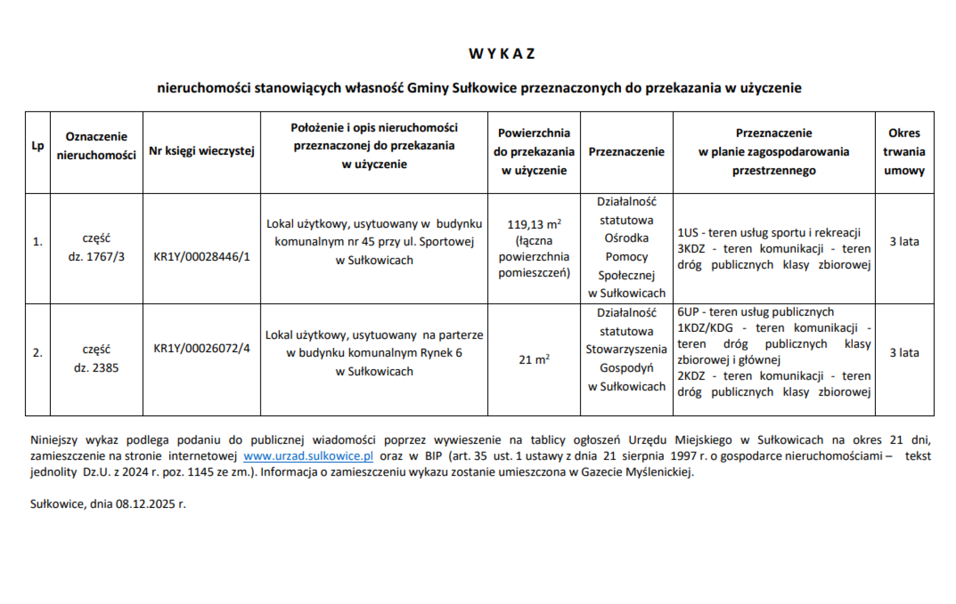 W Y K A Z nieruchomości stanowiących własność Gminy Sułkowice przeznaczonych do przekazania w użyczenie - lokale użytkowe przy ul. Sportowej i Rynek 6