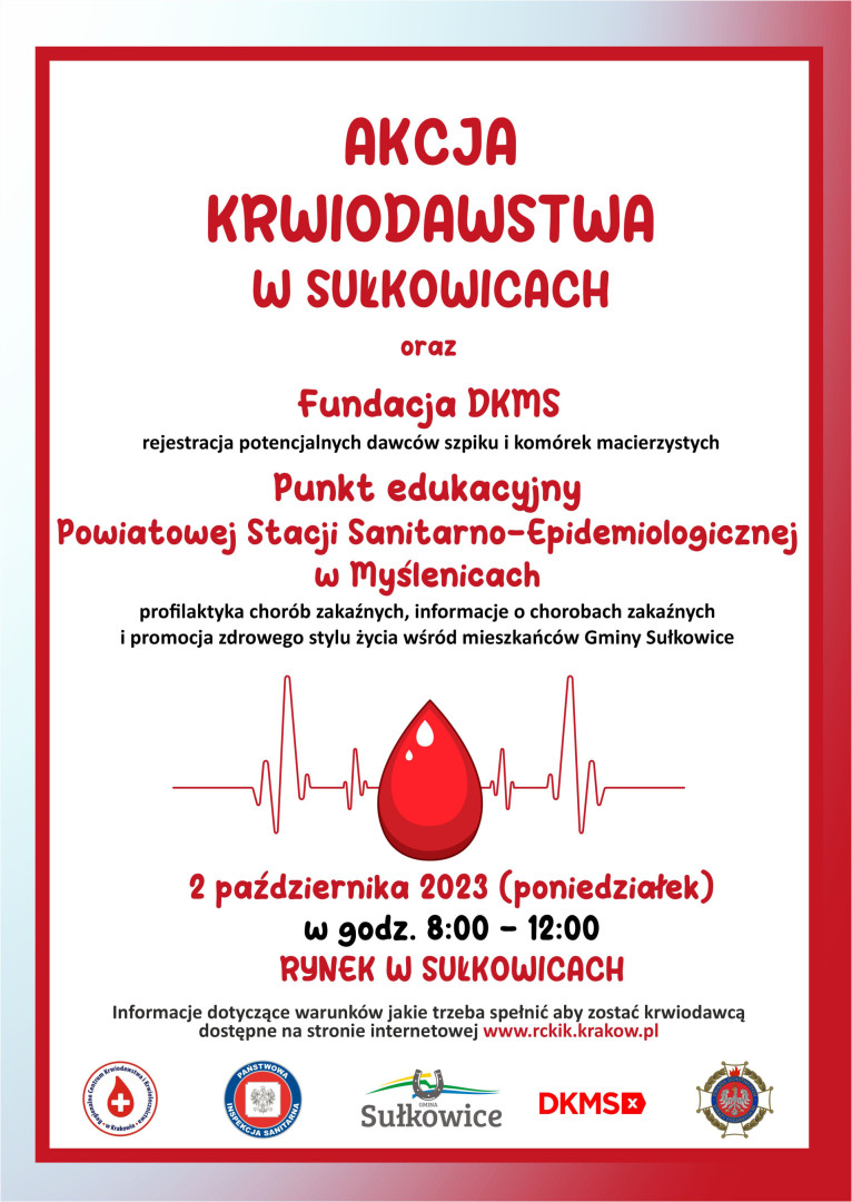 Urząd Miejski w Sułkowicach wraz z Ochotniczą Strażą Pożarną w Sułkowicach zapraszają do udziału w „Akcji krwiodawstwa”, która odbędzie się w poniedziałek 2 października 2023 r. w godzinach od 8:00 do 12:00 w mobilnym punkcie poboru krwi ustawionym w Rynku w Sułkowicach. Ponadto podczas wydarzenia w punkcie DKMS będzie można zarejestrować się do bazy potencjalnych dawców szpiku i komórek macierzystych oraz w punkcie Powiatowej Stacji Sanitarno-Epidemiologicznej uzyskać informacje o profilaktyce chorób zakaźnych.