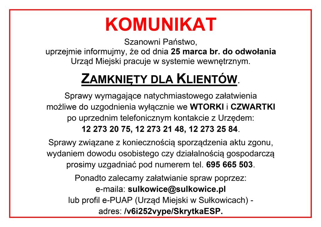 [AKTUALIZACJA] Komunikat dot. pracy Urzędu Miejskiego w Sułkowicach