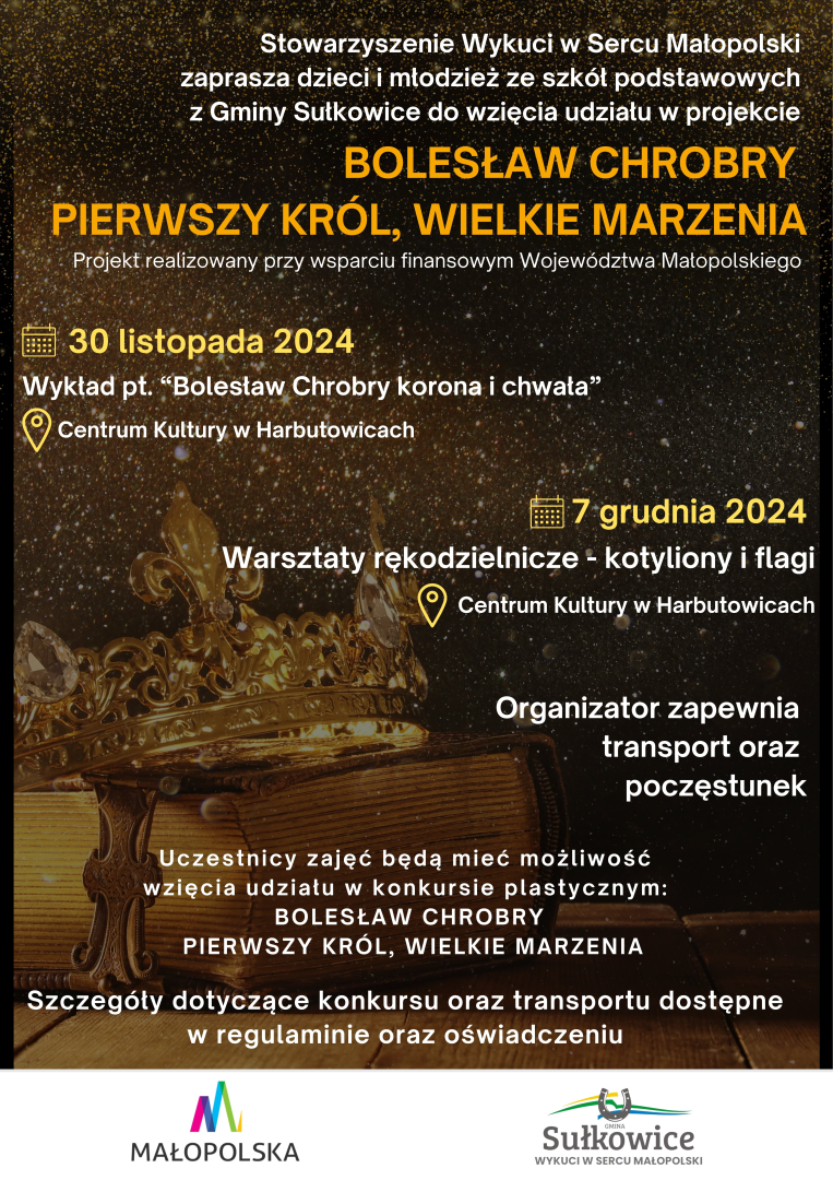 BOLESŁAW CHROBRY - PIERWSZY KRÓL, WIELKIE MARZENIA - zapraszamy do udziału w projekcie dzieci i młodzież z terenu Gminy Sułkowice