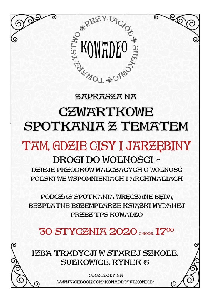 Towarzystwo Przyjaciół Sułkowic KOWADŁO zaprasza na czwartkowe spotkanie z tematem "Tam, gdzie cisy i jarzębiny. Drogi do wolności - dzieje przodków walczących o wolność Polski we wspomnieniach i archiwaliach".