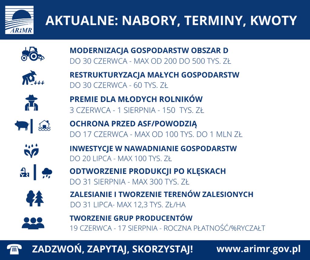 Do programów najpopularniejszych wśród małopolskich rolników należy modernizacja gospodarstw rolnych oraz restrukturyzacja małych gospodarstw. Do 30 czerwca można ubiegać się o pomoc na zakup maszyn rolniczych, inwestycje poprawiające efektywność produkcji czy zabezpieczające przed suszą. Małe gospodarstwo może liczyć na premie w wysokości 60 tys. zł, duże nawet na pół miliona. Te, które zdecyduję się zainwestować w nawodnienie, otrzymają maksymalnie 100 tys. zł. Z wnioskiem muszą zdążyć do 20 lipca..