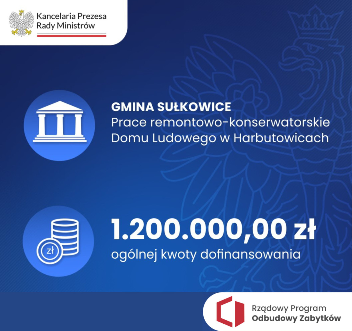 Miło nam poinformować, że Gmina Sułkowice w ramach Rządowego Programu Odbudowy Zabytków pozyskała dofinansowanie w kwocie 1.200.000,00 zł na prace remontowo-konserwatorskie Domu Ludowego w Harbutowicach. Obiekt ten pochodzi z 1931 r. i jest wpisany do Gminnej Ewidencji Zabytków Gminy Sułkowice.