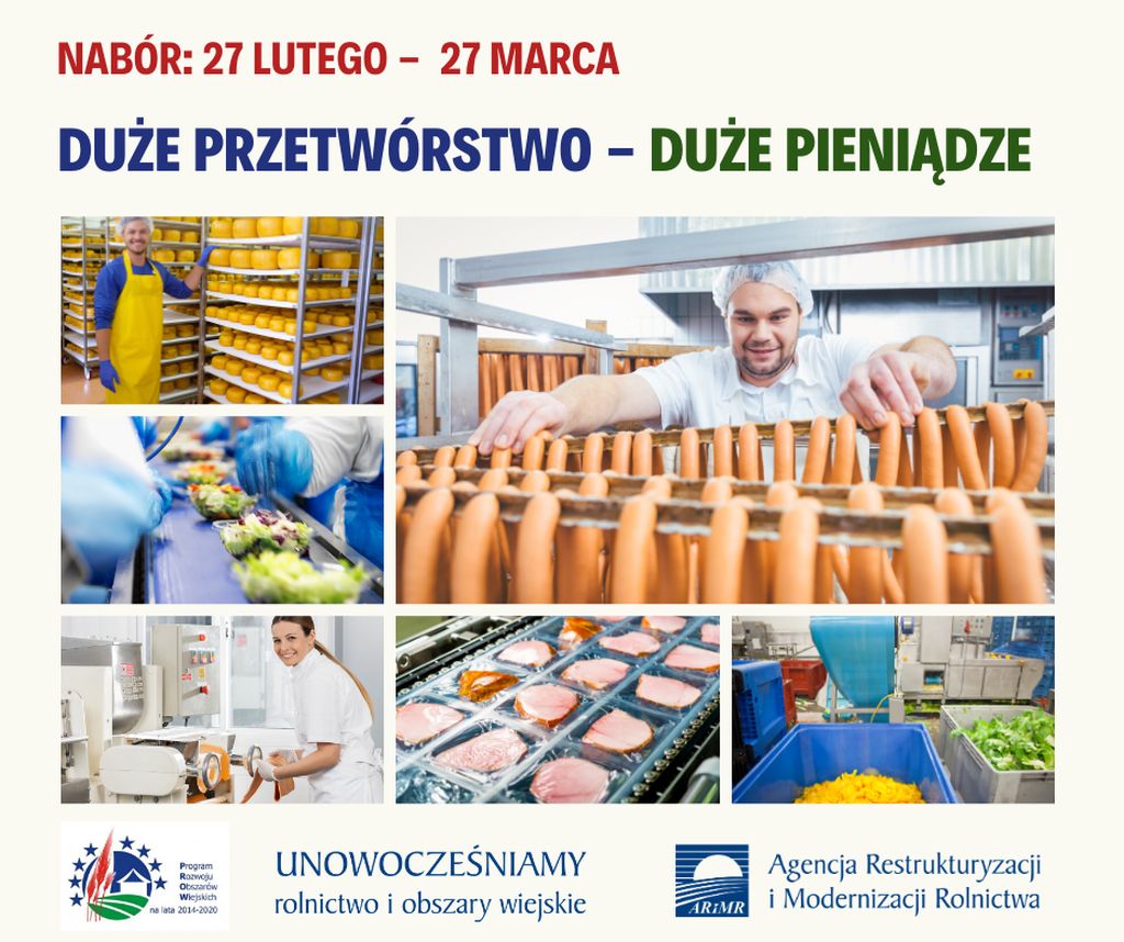 Do 15 mln zł wsparcia będę mogły uzyskać firmy z branży przetwórstwa produktów rolnych. Od 27 lutego do 27 marca 2020 r. oddziały regionalne Agencji Restrukturyzacji i Modernizacji Rolnictwa będą przyjmować wnioski na "Wsparcie inwestycji w przetwarzanie produktów rolnych, obrót nimi lub ich rozwój". O pomoc mogą ubiegać się firmy z branży przetwórstwa produktów rolnych lub zajmujące się ich sprzedażą hurtową.