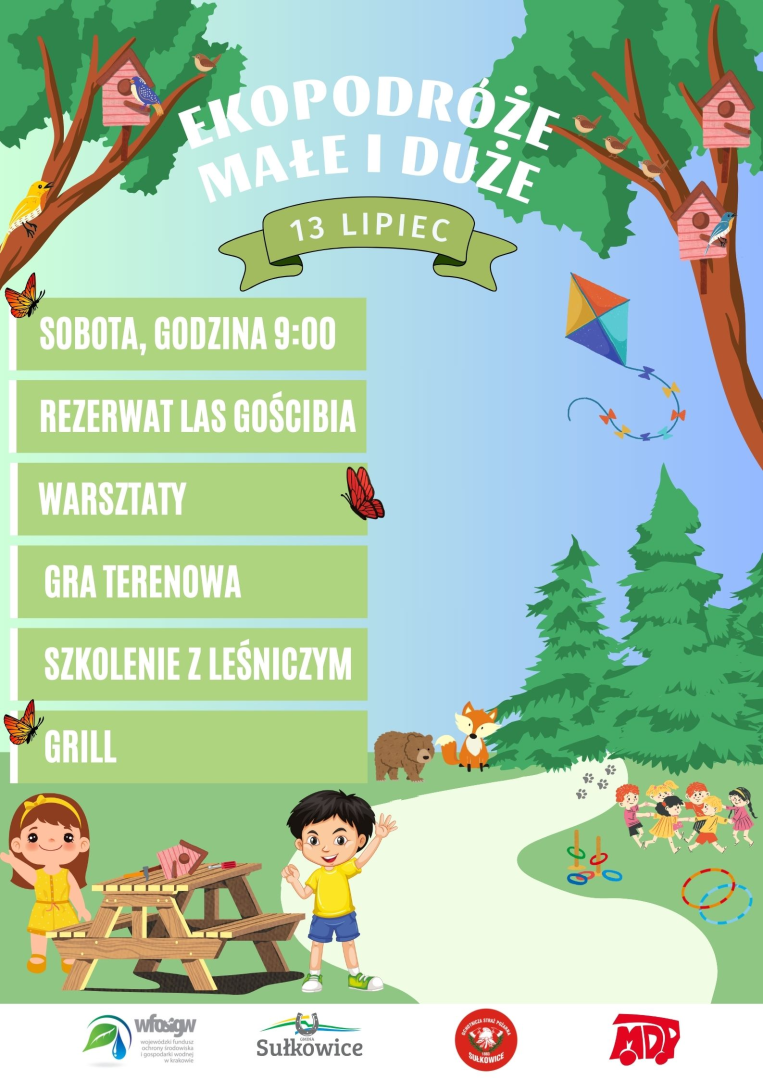 W ramach realizacji Programu Priorytetowego "Edukacja Ekologiczna" WFOŚiGW w Krakowie „Ekopodróże małe i duże” OSP w Sułkowicach zaprasza wszystkie dzieci do udziału w wydarzeniu, w ramach którego zostaną przeprowadzone warsztaty z budowy budek lęgowych dla ptaków, Leśniczy Nadleśnictwa Myślenice przedstawi dzieciom faunę i florę występującą w lokalnych lasach, dzieci wezmą udział w grze terenowej a na koniec zjedzą pyszną kiełbaskę z grilla.