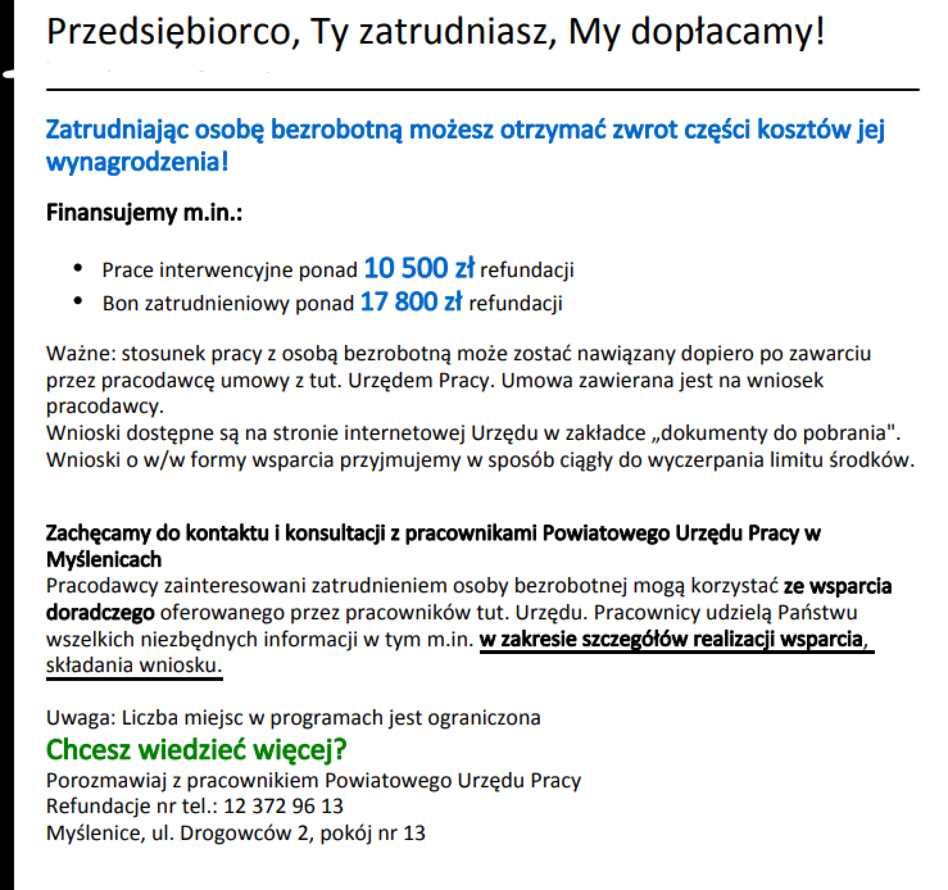 Powiatowy Urząd Pracy w Myślenicach realizuje wsparcie finansowe przedsiębiorców w zakresie zatrudnienia pracowników.