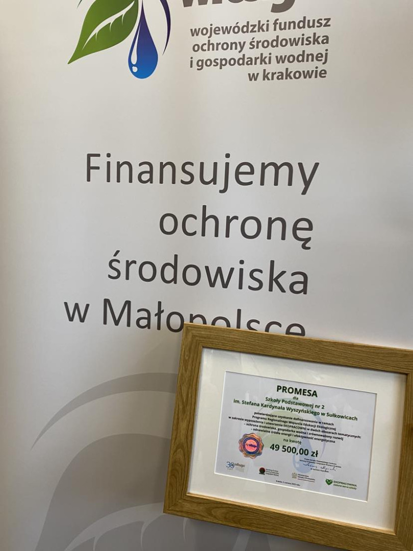 W dniu 5 czerwca 2023 roku delegacja ze Szkoły Podstawowej nr 2 w Sułkowicach w osobie Pana Dyrektora Marcelego Pacuta oraz przewodniczącej Szkoły Anny Lipińskiej wraz z p. Burmistrzem Arturem Grabczykiem oraz pracownikami Urzędu Miejskiego w Sułkowicach: Kierownik Referatu Ochrony Środowiska Panią Barbarą Sroką oraz Ekodoradcą Panią Patrycją Bujas, odebrali z rąk Prezesa Wojewódzkiego Funduszu Ochrony Środowiska i Gospodarki Wodnej w Krakowie pana Kazimierza Koprowskiego, promesę w wysokości 49.500,00zł na stworzenie Ekopracowni.