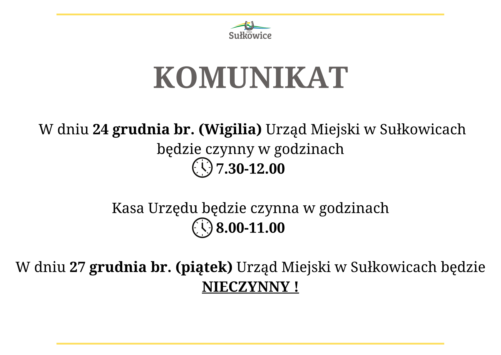 W dniu 24 grudnia br. (Wigilia) Urząd Miejski w Sułkowicach będzie czynny w godzinach