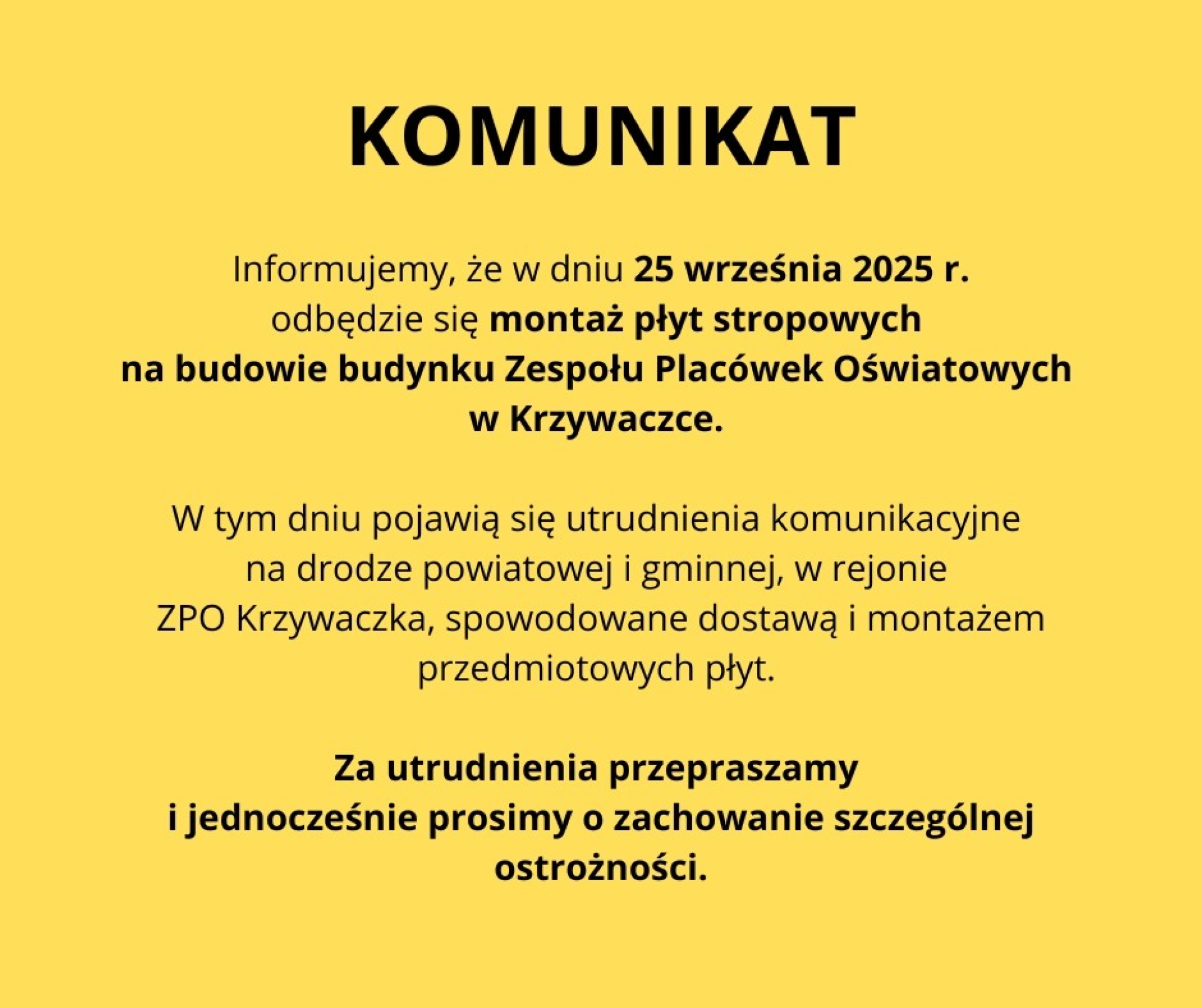 Informacja dotycząca utrudnień drogowych przy ZPO w Krzywaczce w dniu 25 września 2025 r.