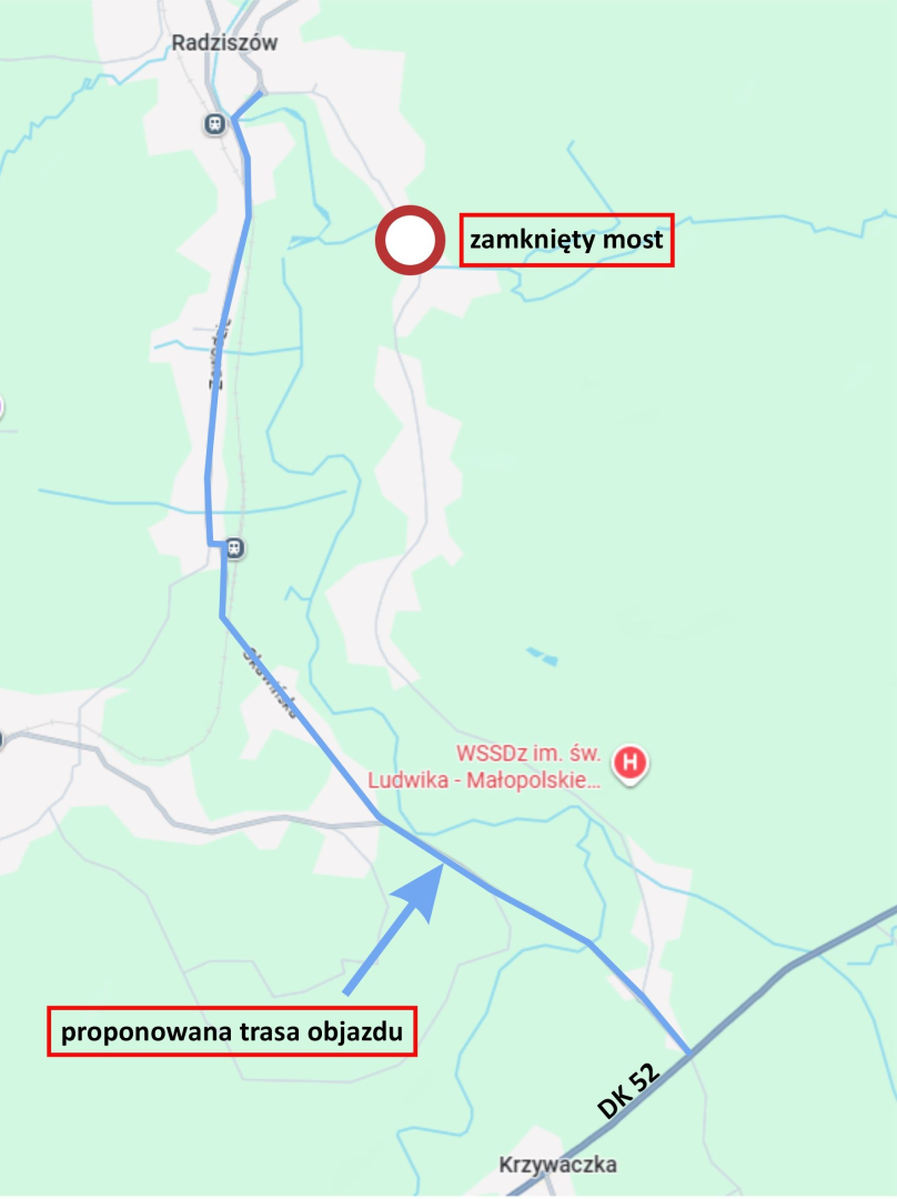 Na czas prowadzonych prac dojazd do miejscowości Skawina od strony DK 52 będzie możliwy wyłącznie przez ul. Skawińską w Woli Radziszowskiej (drugi zjazd na rondzie).