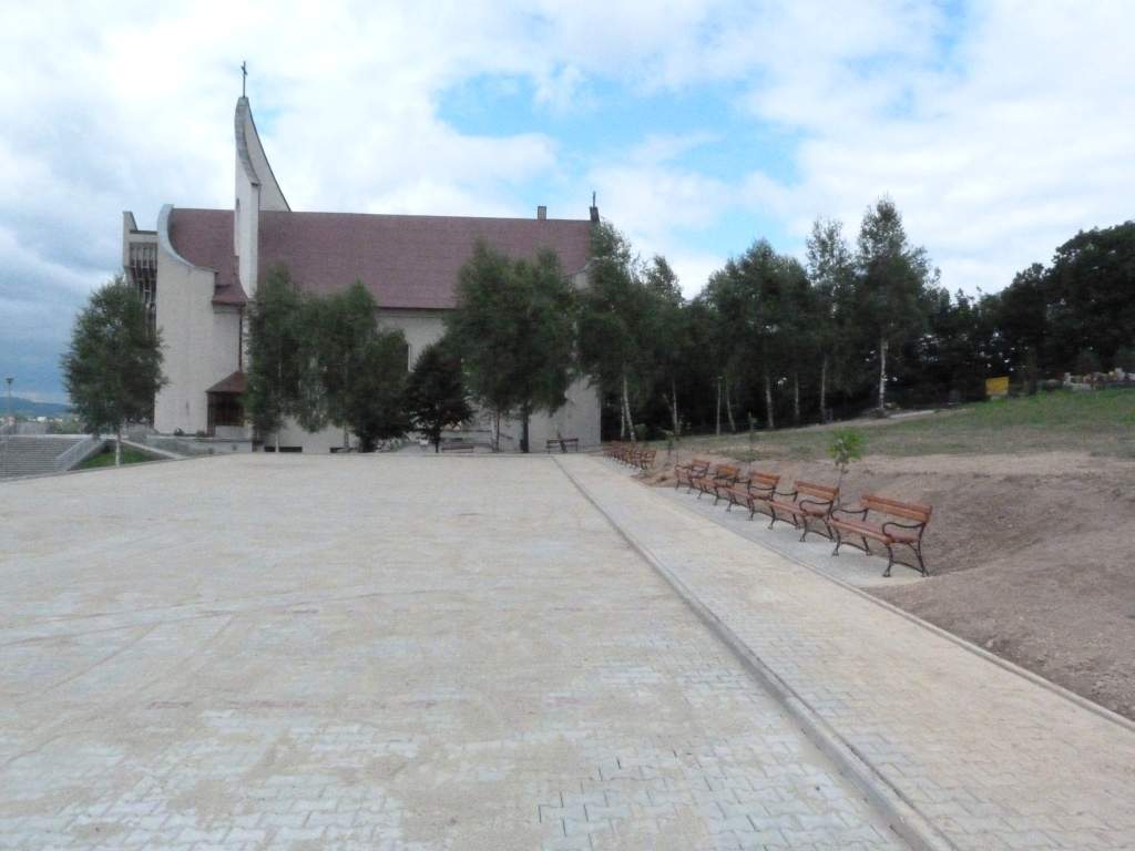 Wykonano nawierzchnię z kostki brukowej o powierzchni: 389,85 m2 - chodnik, 1 368,075 m2 - parking wraz z krawężnikiem i obrzeżem oraz podbudową tłuczniową. Wykonano także dwie studnie odwodnieniowe, oświetlenie zewnętrzne, szatę roślinną oraz zamontowano 20 szt. ławek.