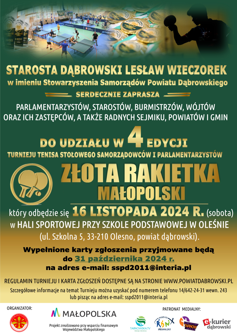 Starosta Dąbrowski Lesław Wieczorek w imieniu Stowarzyszenia Samorządów Powiatu Dąbrowskiego serdecznie zaprasza wszystkich Parlamentarzystów, Starostów, Burmistrzów, Wójtów oraz ich zastępców, a także Radnych Sejmiku Województwa, Radnych Powiatów i Radnych Gmin z terenu województwa małopolskiego, świętokrzyskiego i podkarpackiego do wzięcia czynnego udziału w IV edycji Turnieju Tenisa Stołowego Samorządowców i Parlamentarzystów „Złota Rakietka Małopolski”.