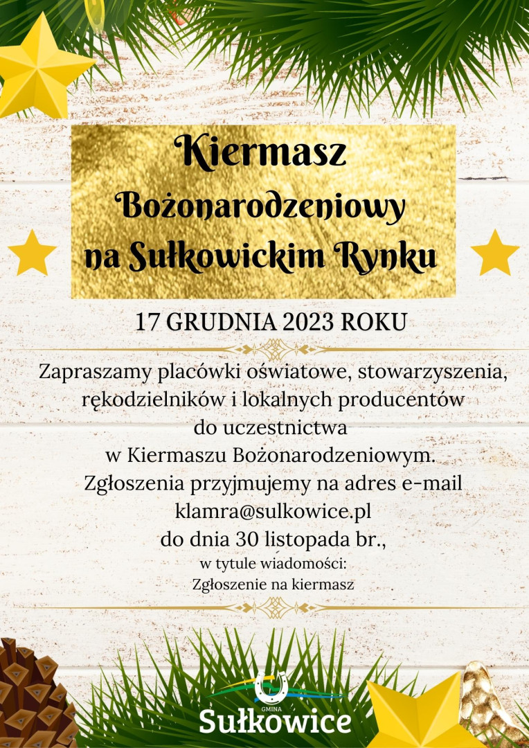 Zgłoszenia przyjmujemy pod adresem klamra@sulkowice.pl do dnia 30 listopada. W tytule wiadomości prosimy dopisać: zgłoszenie na kiermasz.