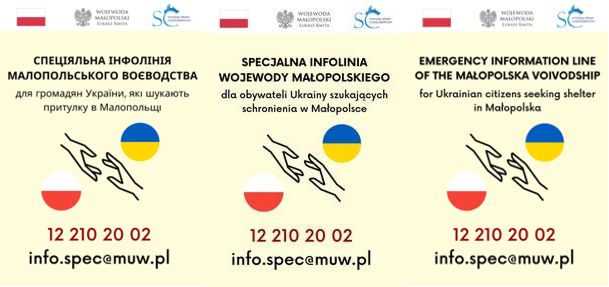 Specjalna Infolinia Wojewody Małopolskiego dla obywateli Ukrainy szukających schronienia w Małopolsce, Infolinia działa 24 h na dobę.