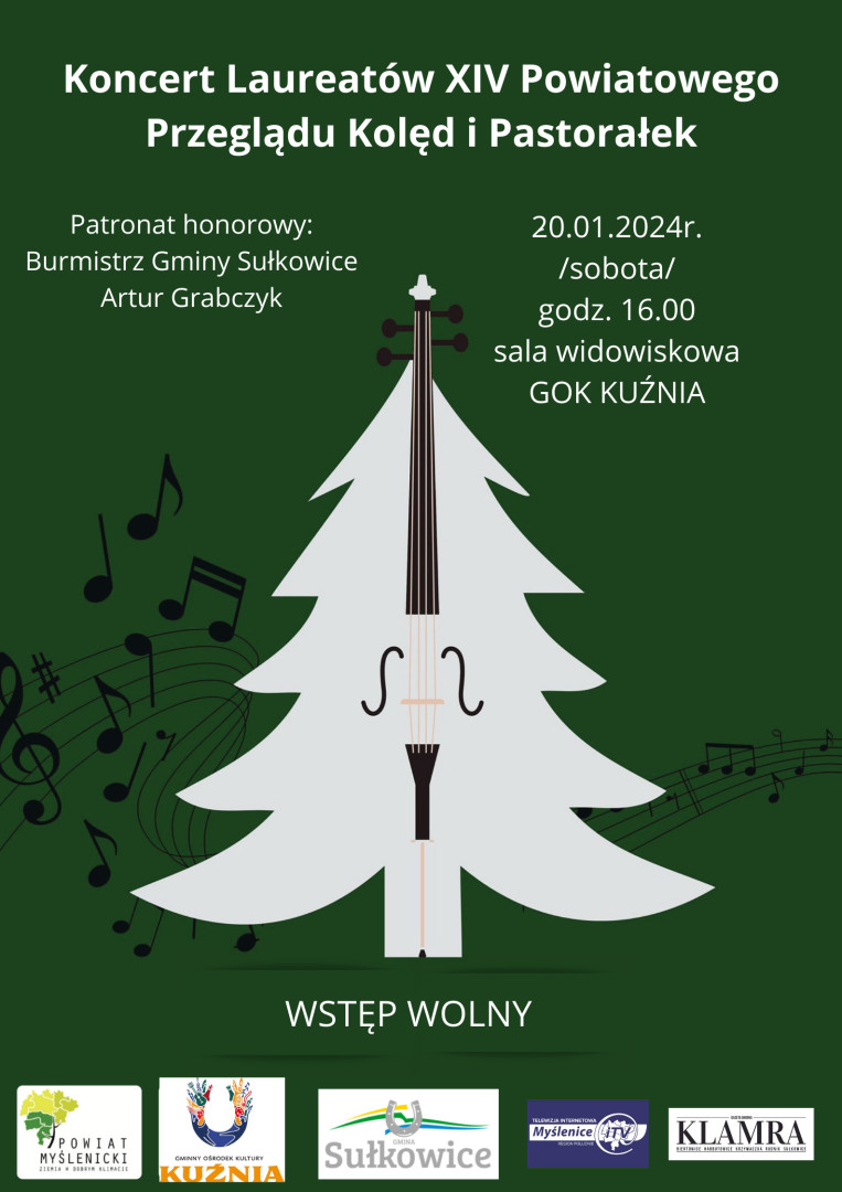 Gminny Ośrodek Kultury "KUŹNIA" w Sułkowicach zaprasza na Koncert Laureatów XIV Powiatowego Przeglądu Kolęd i Pastorałek, który odbędzie się w dniu 20.01.2024r. /sobota/, godz. 16.00 sala widowiskowa GOK "KUŹNIA"