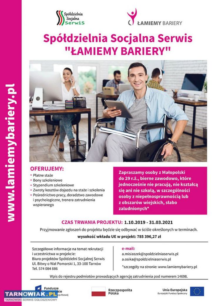 Spółdzielnia Socjalna Serwis zaprasza do wzięcia udziału w projekcie"ŁAMIEMY BARIERY" osoby z niepełnosprawnościami, bierne zawodowo, zamieszkałe na terenie województwa małopolskiego na terenach wiejskich lub słabo zaludnionych w wieku od 15 do 29 lat.