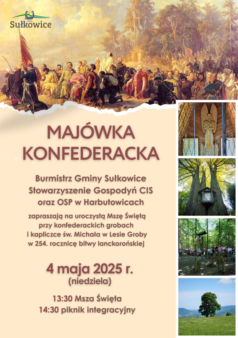 Burmistrz Gminy Sułkowice wraz ze Stowarzyszeniem Gospodyń „CIS” w Harbutowicach oraz OSP Harbutowice zapraszają na uroczystą Mszę Świętą, która odprawiona zostanie w 254. rocznicę bitwy lanckorońskiej przy konfederackich grobach i kapliczce św. Michała w Lesie Groby w dniu 4 maja 2025 r. o godz. 13:30. Po liturgii piknik dla uczestników.