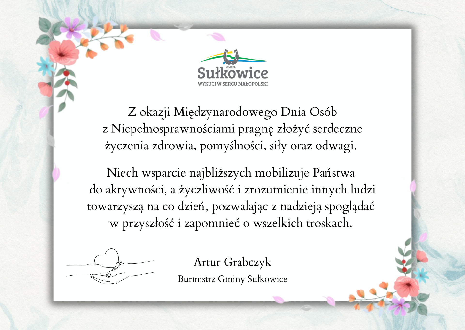 Z okazji Międzynarodowego Dnia Osób z Niepełnosprawnościami pragnę złożyć serdeczne życzenia zdrowia, pomyślności, siły oraz odwagi.