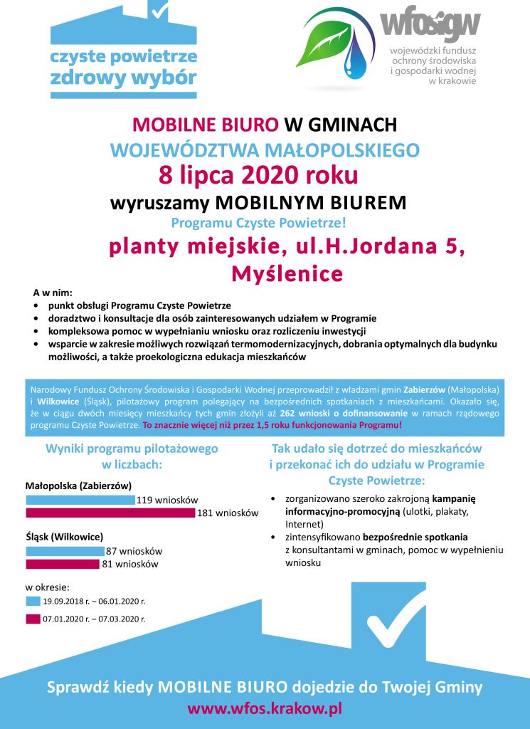 Na plantach przy ulicy Henryka Jordana w Myślenicach w środę 8 lipca rozpocznie swoją trasę mobilne biuro Programu „Czyste Powietrze”, które będą działać na terenie Małopolski oraz Śląska. Środowe mobilne biuro dotyczące możliwych dofinansowań w ramach programu rozpocznie funkcjonalnie o 15:00 i potrwa przez dwie godziny.