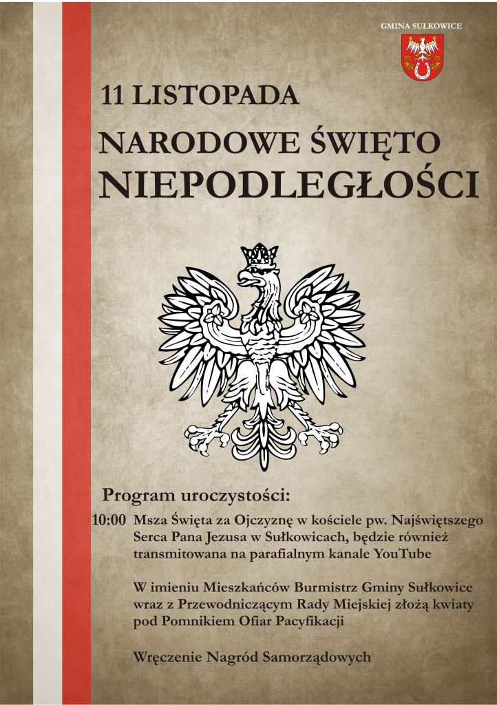 Zapraszamy Mieszkańców Gminy Sułkowice do włączenia się do wspólnej modlitwy podczas Mszy Świętej celebrowanej w intencji Ojczyzny w kościele pw. NSPJ w Sułkowicach o godz. 10:00, która transmitowana będzie również na parafialnym kanale YouTube. Po mszy, w imieniu Mieszkańców Burmistrz Gminy Sułkowice wraz z Przewodniczącym Rady Miejskiej złożą kwiaty pod Pomnikiem Ofiar Pacyfikacji. Wręczone zostaną również Nagrody Samorządowe.