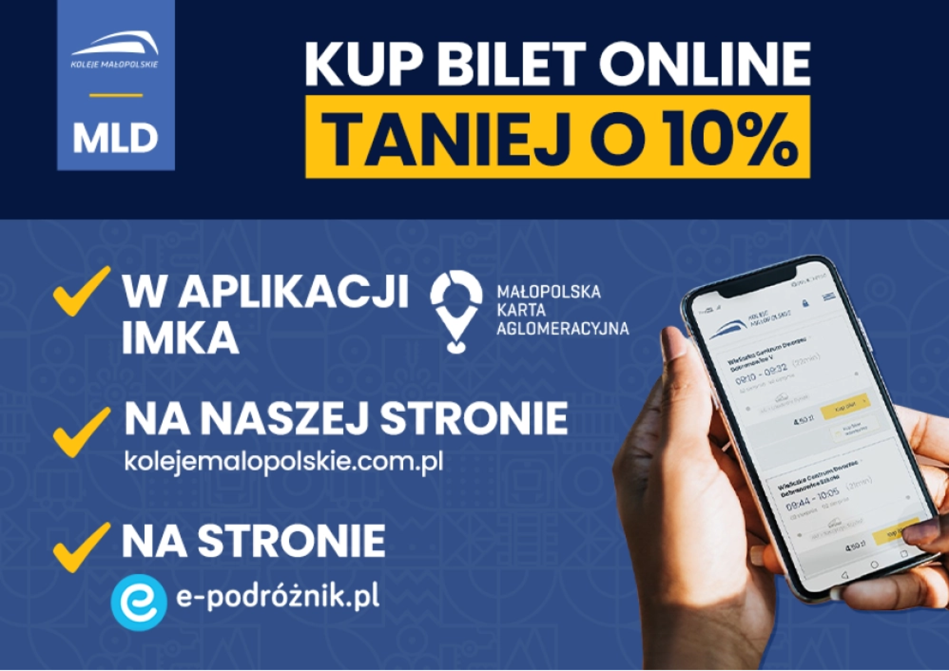 3. Na stronie internetowej Kolei Małopolskich oraz w portalu e-podróżnik (płatności mobilne) – karta płatnicza, blik, Apple Pay.