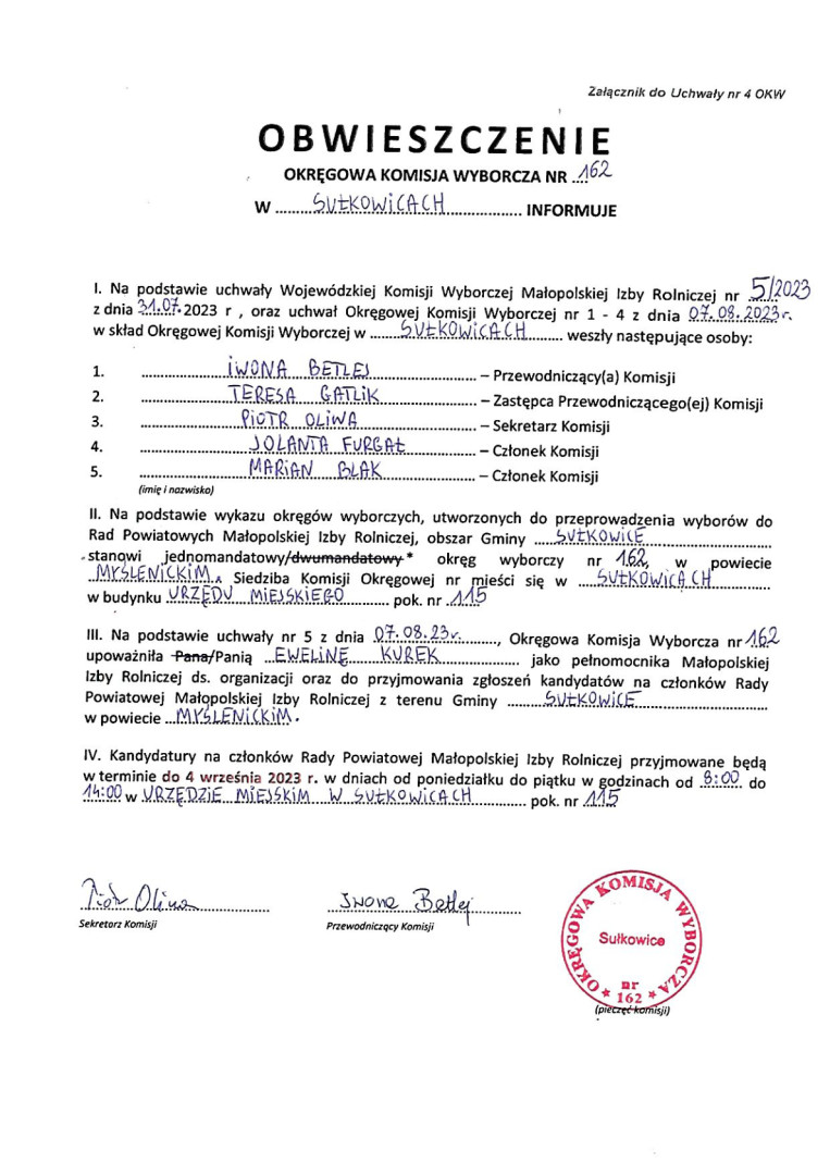 Obwieszczenie Okręgowej Komisji Wyborczej Nr 162 w Sułkowicach